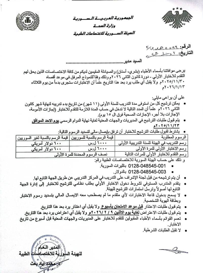 صدور جدول اختبارات البورد السوري (الجزء الأولي) دورة كانون الثاني لعام 2026