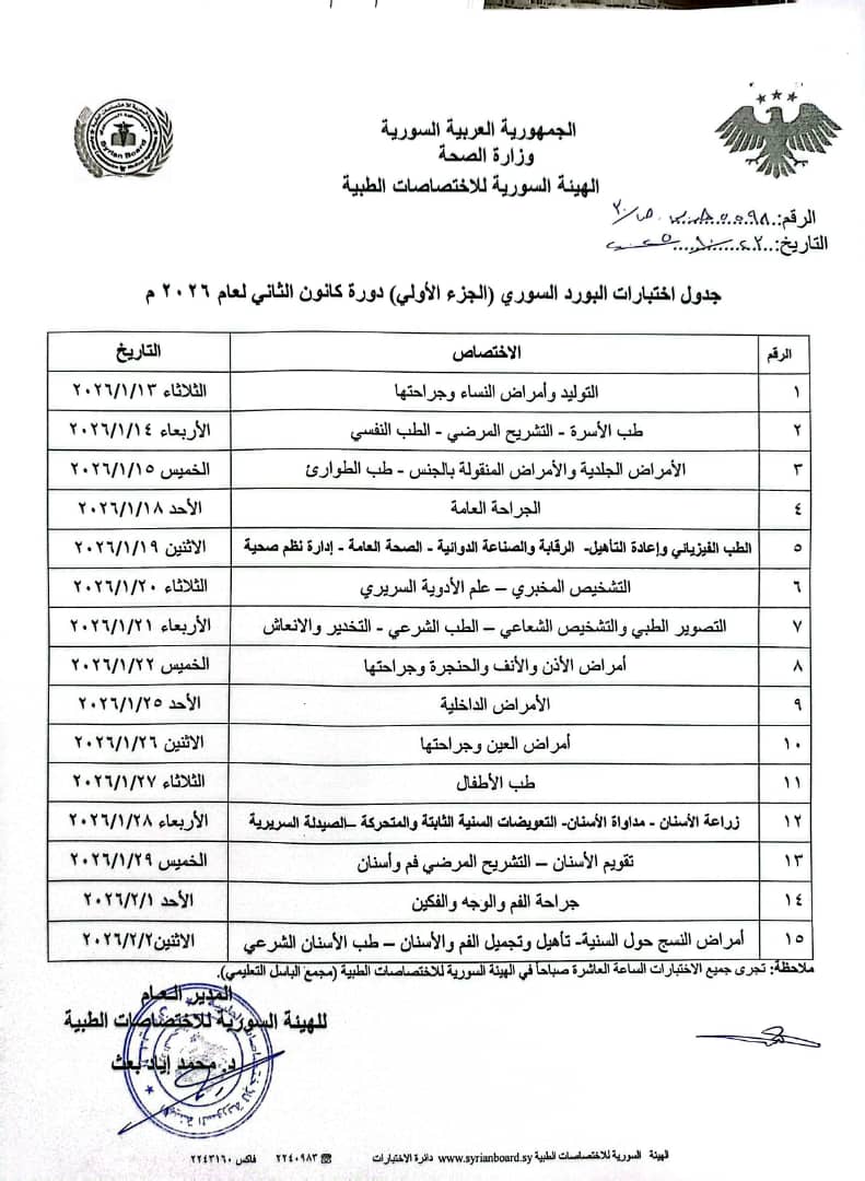 جدول اختبارات البورد السوري الجزء الأول - دورة كانون الثاني لعام 2026م